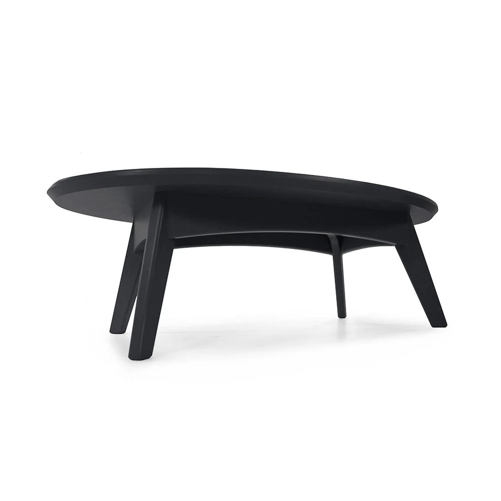 Part of Lollâs collection of Satellite Outdoor Tables, this oval modern cocktail table measures 13 inches high and 42 inches long. It is made from heavy, 1-inch-thick recycled plastic and available in several environmentally friendly colors. The Satellite Outdoor Cocktail Table is also available in rectangle or round versions.